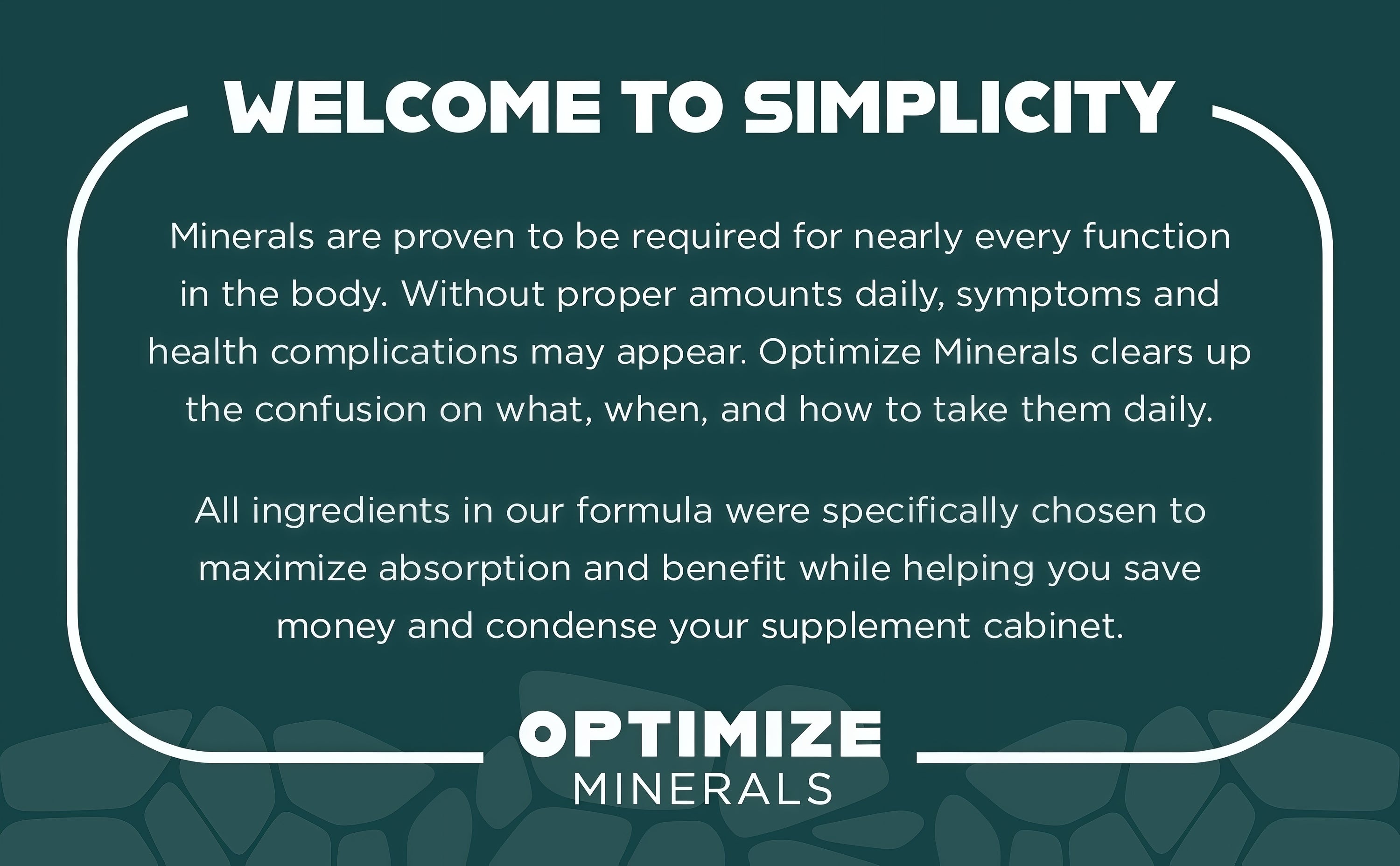 Minerals are proven to be required for nearly every function in the body. Without proper amounts daily symptoms and health complications may appear. Optimize Minerals clears up the confusion on what when and how to take them daily.